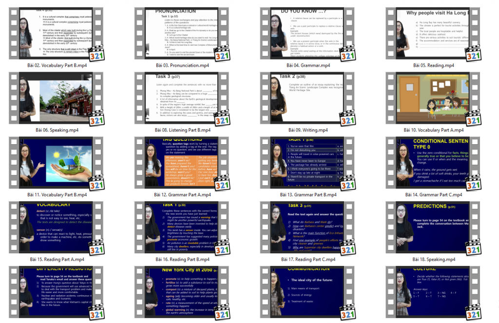 - Mỗi video tập trung vào các phần: từ vựng, ngữ pháp, bài tập đọc, nghe và luyện nói theo từng đơn vị bài học.