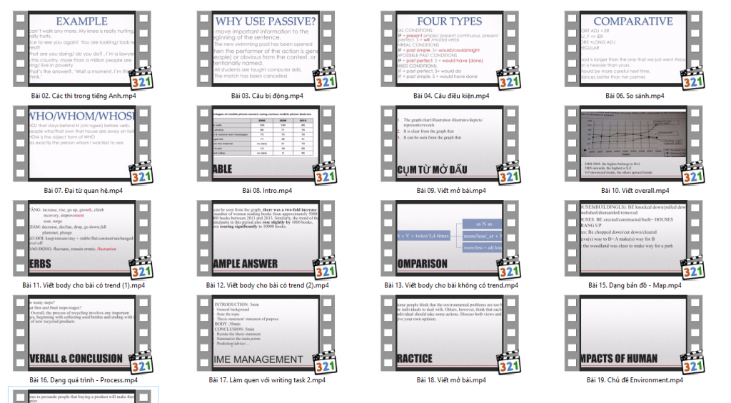 - Hướng dẫn chi tiết về Task 1 (viết báo cáo) và Task 2 (viết luận), các dạng bài thường gặp.